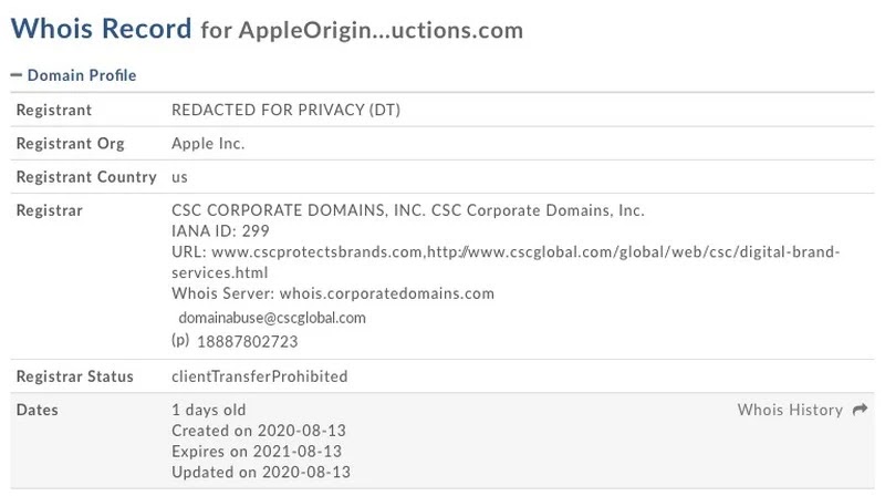 該記錄的域名訊息將 Apple 公司列為註冊人組織。註冊商是 CSC Corporate Domains,這是一家為大公司保護域名的公司,Apple 公司的域名註冊也是由該公司負責。