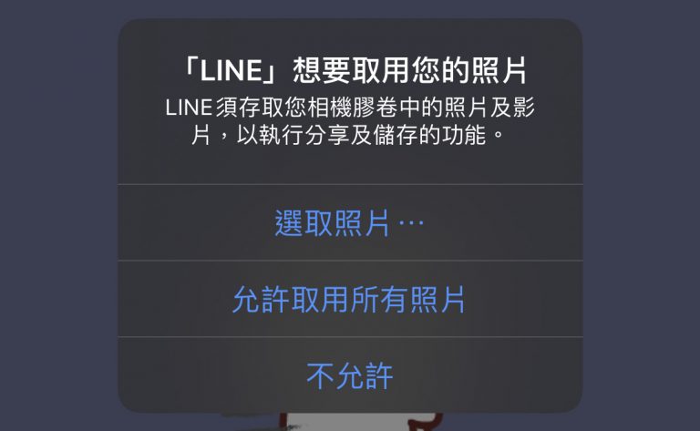iPhone / iPad 在更新到 iOS 14 系統後,當某 App 想要取用你照片或影片時就會彈出「XXX 想要取用您的照片」LINE 須存取您的相機膠卷中的照片及影片,以執行分享及儲存的功能。這是因為在 iOS 14 系統能讓用戶完全保有 Apps 的安全性與隱私權,任何 App 想要儲取用戶的照片、影片、麥克風或相機都需經過用戶再次確認。