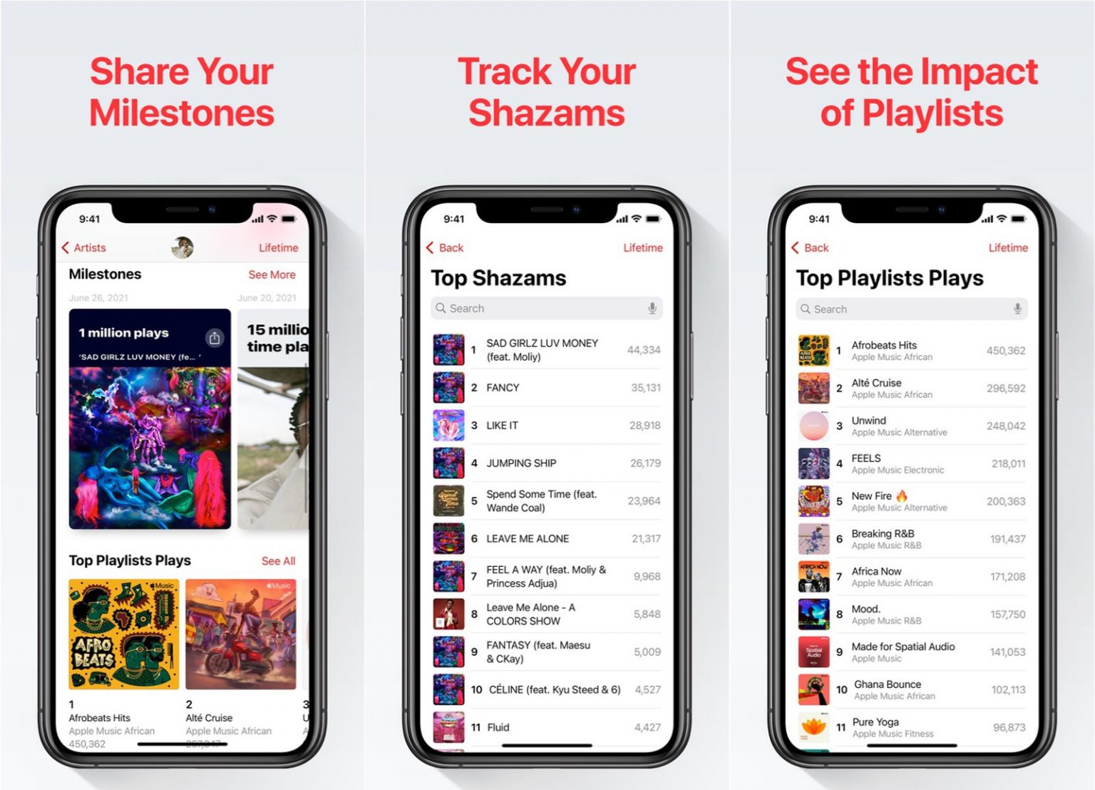 Apple Music for Artists 適用於所有使用 Apple Music 的藝術家,它為藝術家和他們的團隊提供歌曲、專輯、播放列表等的銷售和串流媒體數據。