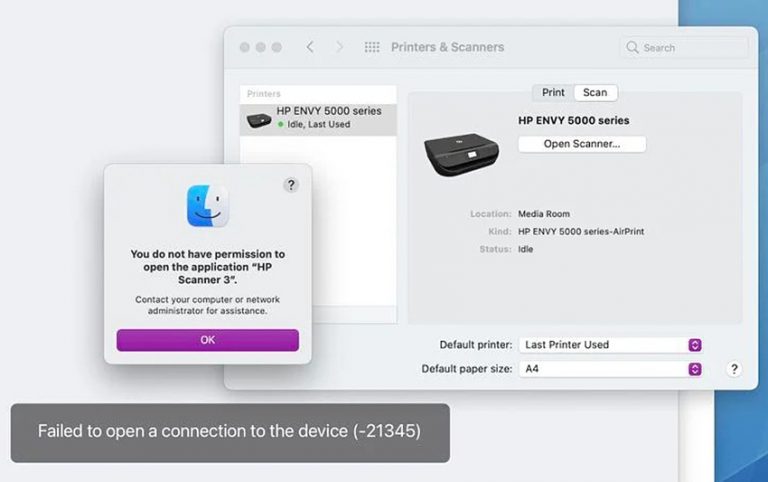 Mac 上嘗試連接到掃描器並開始掃描時,您可能會收到一條訊息,表示您沒有權限來打開應用程式,後面緊跟掃描器驅動程式的名稱。這一訊息會提示您聯絡您的電腦或網路管理員尋求協助,或者表明您的 Mac 無法打開與設備的連接 (-21345)。從 macOS Big Sur 11.6 開始,使用掃描器時與權限相關的錯誤已被修復