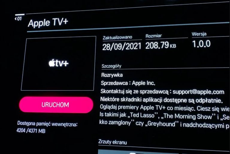 舊款 LG 智慧電視應用界面看起來與標準的 Apple TV 應用非常相似,但它只允許基於 webOS 的舊電視的所有者觀看 Apple TV+ 影視內容。iTunes Store 和 Watch Now 標籤已從頂部導航選單中刪除,只留下三個選項: Apple TV+、搜尋和設定。
