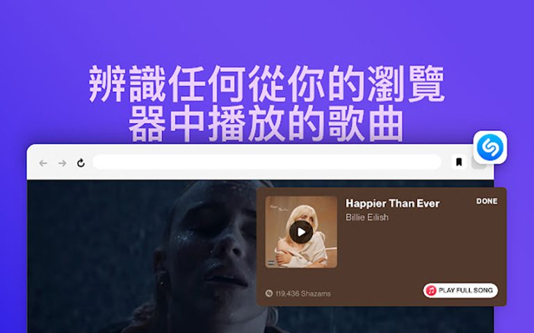 下載並安裝《Shazam》的瀏覽器擴充功能,點一下就能辨識歌曲,不花一分錢就能發現藝人、歌詞和影片!《Shazam》每個月辨識高達 10 億首歌曲。