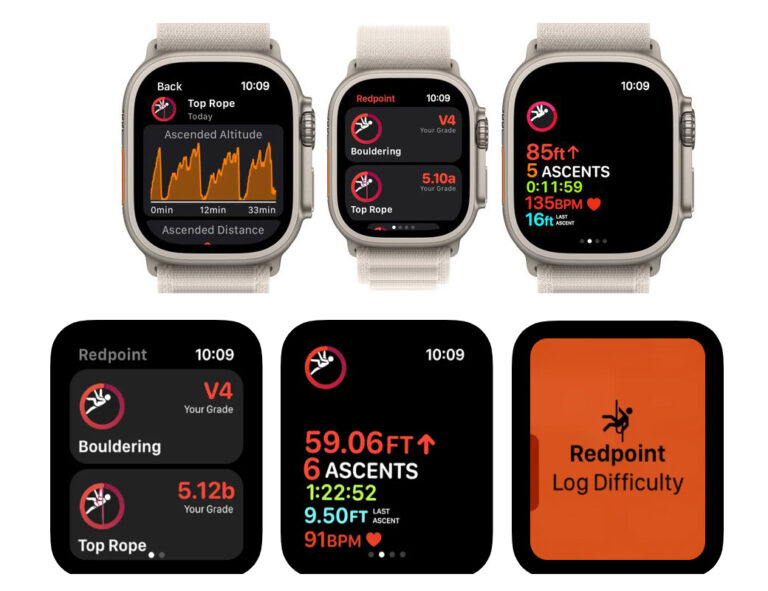 對於 Apple Watch Ultra,自動分配給行動按鈕的 Redpoint 功能包括開始新的攀岩訓練,記錄路線的難度,以及記錄路線的勾選類型,使攀岩者能夠與手錶互動,而不會在螢幕上沾到攀岩粉筆。