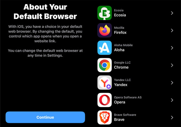 蘋果不僅讓 iOS 用戶設定第三方瀏覽器為預設,更為滿足數位市場法案,推出全新的選擇介面。當使用者首次開啟 Safari 於 iOS 17.4或更新版本時,將看到此介面,以提示歐盟用戶從多款瀏覽器中挑選預設瀏覽器。