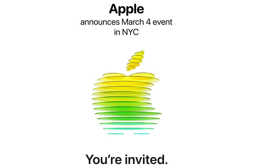 邀請函上是一個由 黃色、綠色、藍色圓盤組成的 3D Apple 標誌。熟悉 Apple 設計語言的人都知道,顏色與立體層次往往暗示: